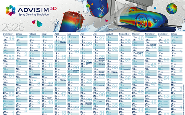 Die Falschfarben und Prozessgrafiken der ersten virtuellen Sprühreinigungssimulationssoftware ADVISIM3D finden viele Kunden und Interessenten beeindruckend. Deswegen und weil wir sie selber lieben gibt es nun bereits zum dritten Mal für 2026 einen ADVISIM3D Jahresplaner. Wir freuen uns.